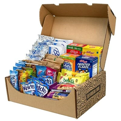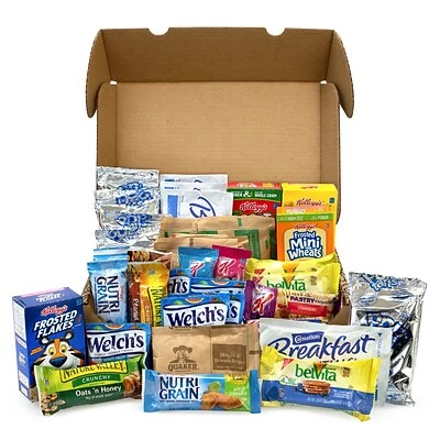 Each box contains: six PopTarts Variety, five Quaker Oatmeal Flavor Variety, three Nature Valley Crunchy Granola Variety, four Carnation Breakfast Essentials, four Kellogg’s Cereal Assortment, four Special K Pastry Crisps Blueberry, four Belvita Breakfast Biscuits Blueberry, two Emerald Breakfast On, four Nutri Grain Breakfast Bars Assorted, five Welch’s Mixed Fruits Snacks