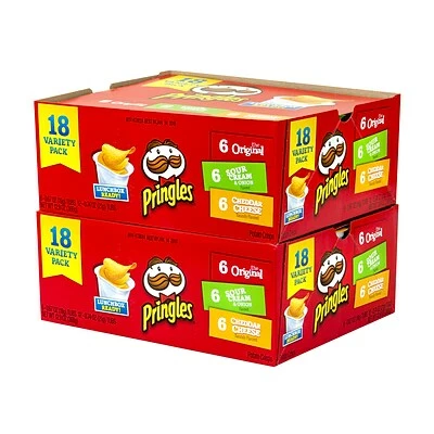 Fill student lunch bags or office break room snack drawers with these chip packs. The choice between sour cream and onion, original, and cheese flavors meets multiple taste preferences, and 0.67-ounce and 0.74-ounce cups are just enough crunch to appease afternoon hunger. This box of Pringles Snack Stack variety chips includes 2 -18 packs for a total 36 cups for several weeks’ worth of munching.