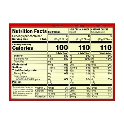 Carton contains: 12 cheddar cheese flavored containers, 12 sour cream and onion flavored containers, and 12 containers with the original flavor (36 containers total)