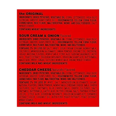 Satisfy your snack craving with the irresistible taste of original flavor, cheddar cheese flavor, and sour cream and onion flavor potato chips
