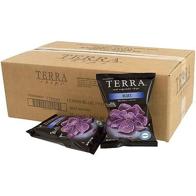 Satisfy afternoon cravings with this 1-ounce bag of vegetable chips. The non-GMO, gluten-free ingredients provide a healthy alternative to vending machine fare, and the vibrant bluish-purple chips are made from real potatoes. This 24-count box of Terra Blues vegetable chips contains a plentiful supply of slightly nutty-flavored snacks to share with friends or co-workers.