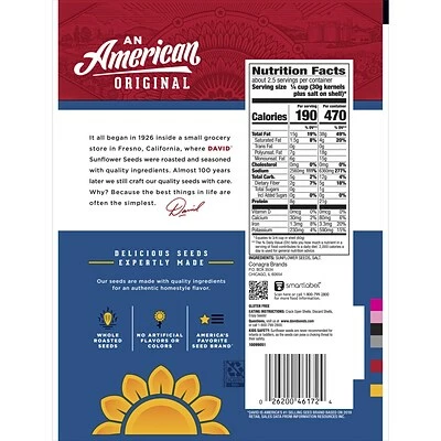 Grab a pack of DAVID Original Sunflower Seeds for a satisfying snack to help you stay in the game when every minute counts. DAVID Seeds are a delicious, and crunchy bite on the go. Best served anywhere and anytime, these handy to-go snacks are easy to carry for those moments when hunger strikes. Each 5.25 oz Pack contains about 2.5 servings, with 190 calories, 8 grams of protein, and 2 grams of fiber, as well as 10% of your daily allowance of Vitamin E, 25% of phosphorus, and 30% of magnesium per serving. Since 1926, DAVID Seeds provides a quality difference that you can taste with select top-quality seeds, roasted and seasoned to perfection. This Pack contains twelve 5.25 oz bags of DAVID Original Sunflower Seeds, great for group and solo snacking.