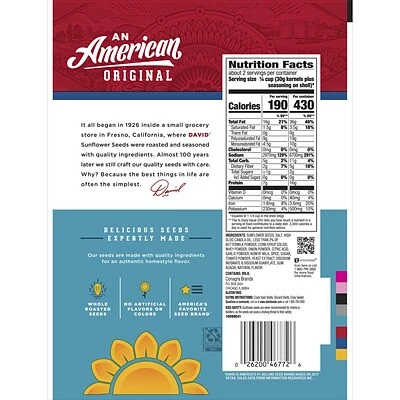 Grab a pack of DAVID Ranch Jumbo Sunflower Seeds for a satisfying snack to help you stay in the game when every minute counts. Whenever you need an on the go snack to keep you moving, wrap your mitts around a bag of these seeds to satisfy your hunger. Snack on these satisfyingly crunchy and salty sunflower seeds whenever hunger strikes. Each 5.25 oz Pack contains about 2 servings, with 190 calories, 7 grams of protein, and 2 grams of fiber, as well as 10% of your daily allowance of Vitamin E, 25% of phosphorus, and 25% of magnesium per serving. Since 1926, DAVID Seeds provides a quality difference that you can taste with select top quality seeds, roasted and seasoned to perfection. This Pack contains twelve 5.25 oz bags of DAVID Ranch Jumbo Sunflower Seeds, great for group and solo snacking.