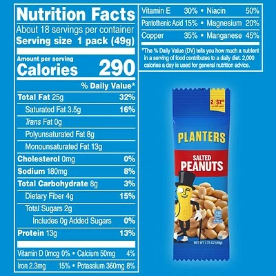 These pouches of peanuts are perfect for eating on-the-go, in between meetings, or when you’re lounging around the house! Planters Salted Peanuts, 1.75 oz, 18 Count are bursting with deliciously crunchy flavor. Each box contain eighteen 1.75 ounce pouches of Salted Peanuts.These Kosher peanuts are a great alternative to sugary or unhealthy snacks. Planters Salted Peanuts, 1.75 oz, 18 Count is a must have for the office break room, or packed in your lunch each day for a protein-packed peanut snack!
