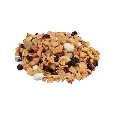 Trail mix contains roasted peanuts, banana chips, raisins, pineapple, and yogurt-covered raisins