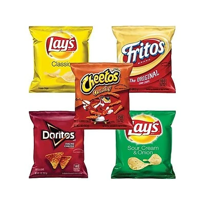 Variety pack contains 16 Cheetos crunchy chips, 12 Lay’s Classic chips, 10 Fritos original corn chips, 8 Doritos nacho cheese tortilla chips, and 4 Lay’s sour cream and onion chips