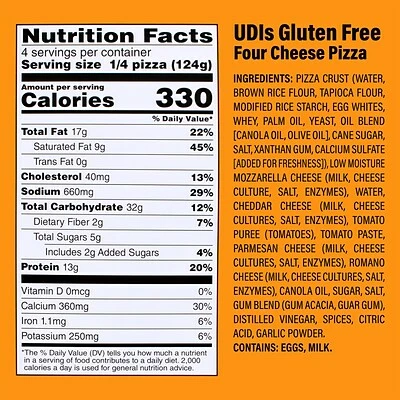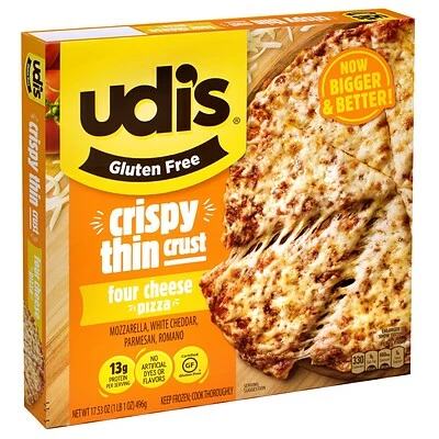 Our delicious four cheese pizza starts with our savory sauce of tomatoes, olive oil, spices, and garlic, spread over Udi’s baked-to-perfection thin and crispy gluten-free crust
