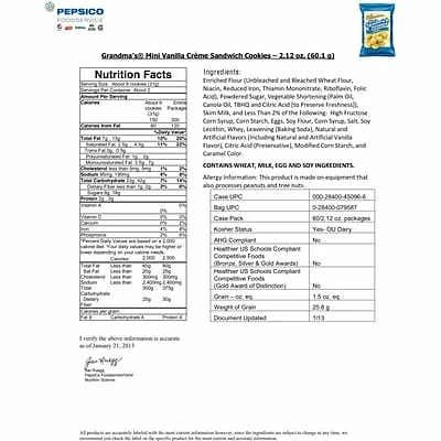 Grandma’s® Mini vanilla creme cookies are perfect for children’s party. Cookies are sold in 2.12 oz bag with 60 bags per box.