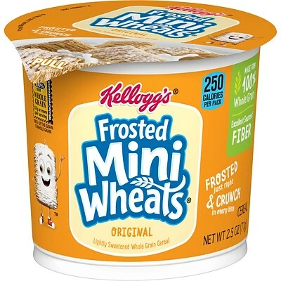 Start the workday right with individual servings of frosted wheat breakfast cereal. Whole grains and fiber promote healthy eating, while the 2.5-ounce cups offer convenient single servings for a quick on-the-go snack. With six cups per box, this Frosted Mini Wheats cereal makes a great break room staple.