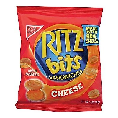 Ritz Bitsยฎ Cheese cracker sandwiches contains cheese fillings. Sandwiches weigh 1.5 oz. and is sold as 60 bags per box.