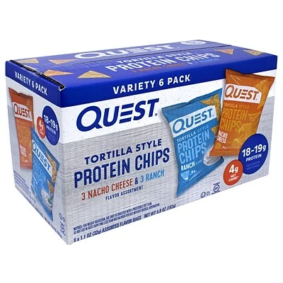 A 6-count variety pack of Quest Tortilla Style Protein Chips. Included: three bags of Ranch and three bags of Nacho Cheese flavored tortilla chips. A perfectly savory, crunchy, and delicious chip that also packs a protein punch! Whether you prefer cheesy, spicy, or zesty, this variety pack has something for everyone. Munch on this delectable, healthy alternative to traditional chips without the added carbs, sugar, and preservatives.
