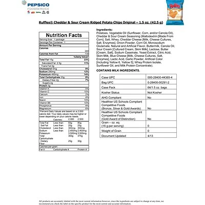 Ruffles? Cheddar and sour cream potato chips are free from trans fat. Chips weigh around 1.5 oz. and is sold as 64 bags per box.
