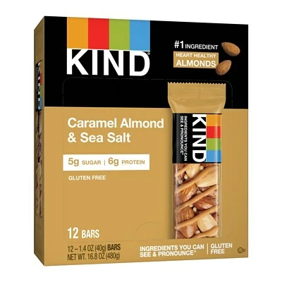 Grab these caramel, almond, and sea salt granola bars when looking for a filling, single-serving snack. These tasty snack bars are approved for gluten-free and kosher diets. This box contains 12 individually-wrapped KIND bars that can be easily stored in briefcases, purses, or backpacks for hungry moments between meals.