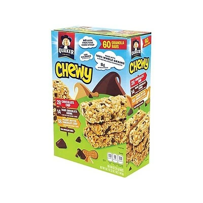 Enjoy a new way to up your energy with these portable snack bars. Grab your choice of chocolate chip or peanut butter chocolate chip for a soft and chewy snack that’s full of nutritious whole grains. Individually wrapped in a single-serving size, Quaker Chewy bars are ideal grabbing and eating on the go.