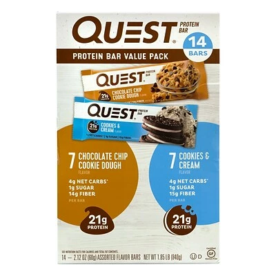 A 14-Bar value pack of Quest Protein Bars in Chocolate Chip Cookie Dough and Cookies & Cream flavors