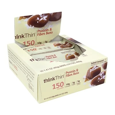 A 10 bar box of thinkThin Protein Bars in Salted Caramel flavor