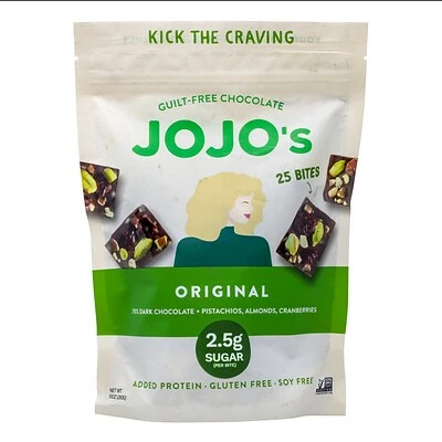 JOJO’s Original Dark Chocolate Bites were created in Momma Jojo’s home kitchen while she battled cancer and her daily sugar cravings. Looking for a delicious low sugar chocolate snack that she could enjoy without the guilt she created her very own dark chocolate bar with 1/2 the sugar of the average candy bar. Each bite includes 70% dark chocolate, almonds, pistachios, dried cranberries, and added plant based protein. Designed to satisfy your sugar cravings JOJO’s is the first ever healthy dark chocolate bar with added plant-based protein.