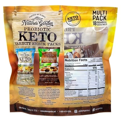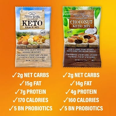 An 18 count pack of Nature’s Garden Probiotic Variety Snack Packs with 9 – 1oz indiviudal servings of Probiotic Keto Snack Mixes and 9 Choconut Keto Mixes. Both mixes are high in fat and protein but low in carbs making them a great Keto certified snack. Whether you prefer salty and cheesy or coconut and chocolate this snack pack variety has it all!