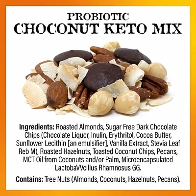 Choconut Keto Mix includes almonds, pecans, hazelnuts, roasted coconut chips and dark chocolate with 14 grams of fat and only 2 net carbs