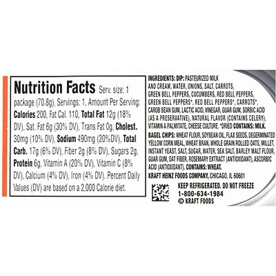 Philadelphia bagel chips and garden vegetable cream cheese dip is a convenient and flavorful on-the-go snack that is easy to carry anywhere. The deliciously smooth cream cheese dip pairs perfectly with multigrain bagel chips. The chips and cream cheese dip stay separated in the convenient 2.5 oz. tray, enough to fill your snack cravings any time of day. With no artificial flavors, this is a snack pack you can feel good about.
