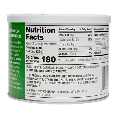 Cashews are high in protein, and an excellent source of Fiber. These are great for office, home or break-room snacking and for any snack bowl. Superior Nut Roasted & Salted Cashews are the perfect on-the-go snack to curb your cravings.