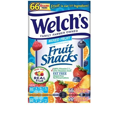 Excellent source of Vitamins A & E. Welch’s juices have been family favorites for more than six generations. Made with real fruit and fruit juice. Welch’s Fruit Snacks are sure to please your family. Made in the USA.